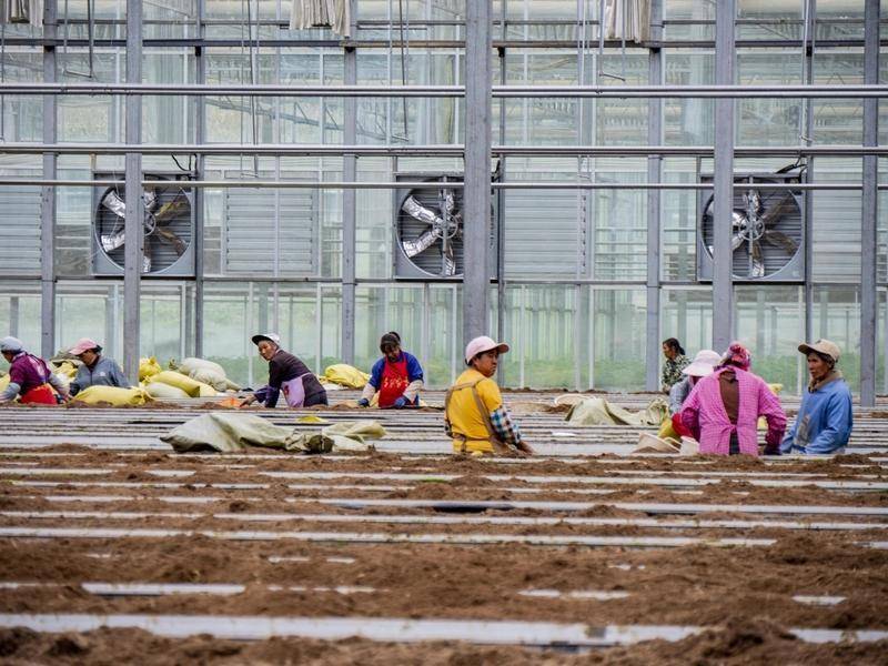 工人铺设椰糠为下一季生产做准备。余军摄