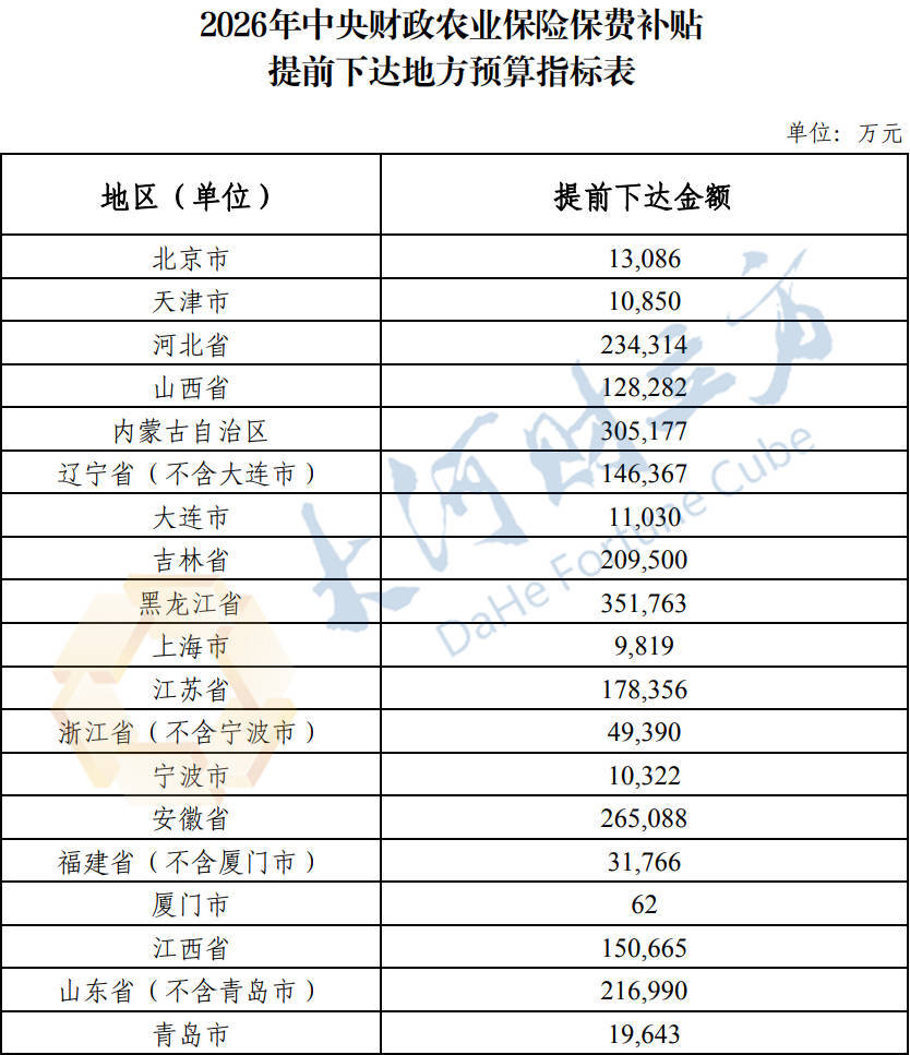 通知提出,为提高预算完整性,加强预算支出管理,支持农业保险发展,现安排中央财政农业保险保费补贴2026年提前下达部分,待2026年预算年度开始后,按程序拨付使用。